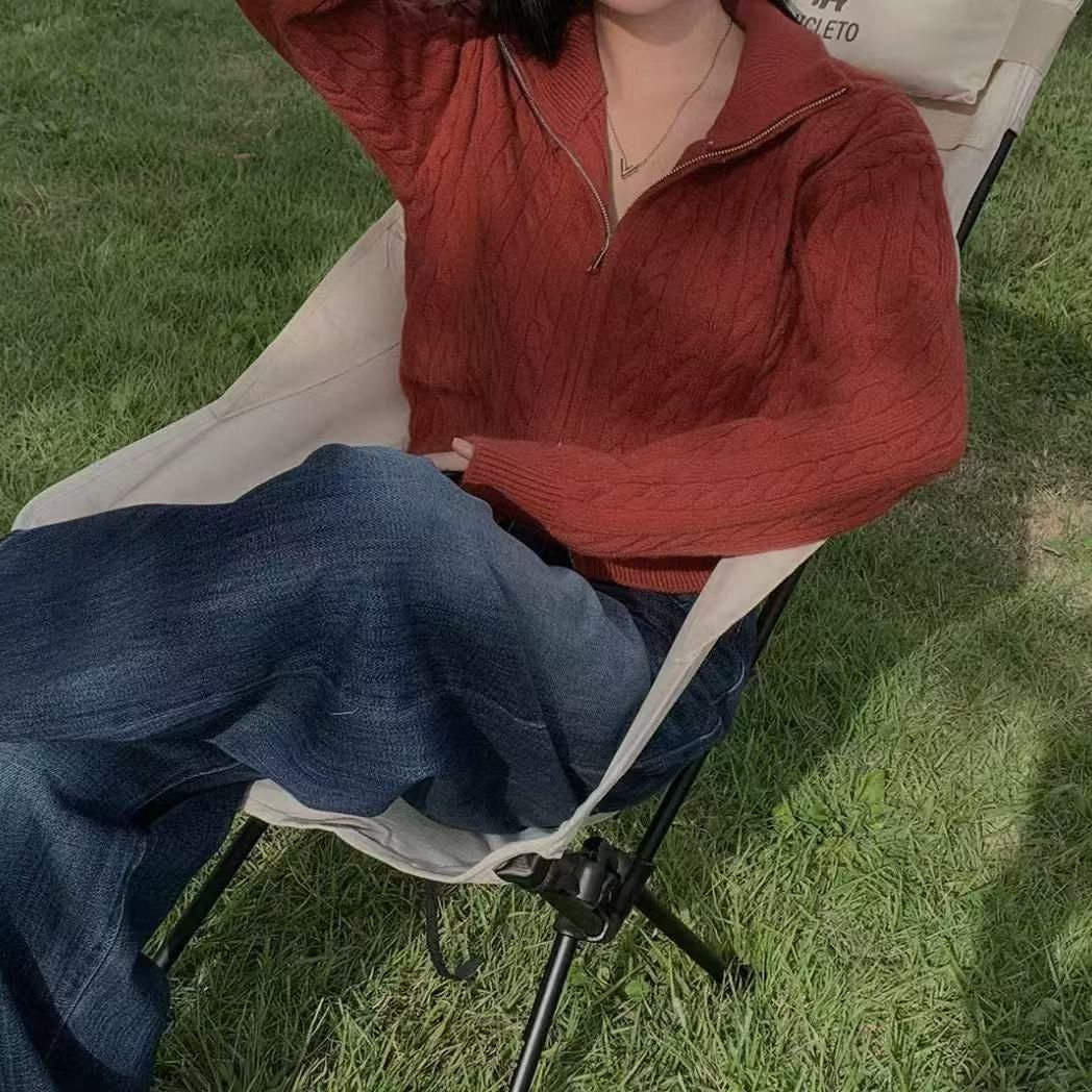 High-grade Lapel Double Zipper Twist Solid Color Sweater